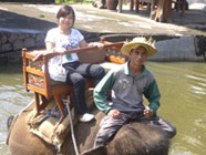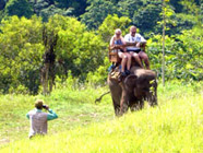 乗象時間?は約30分のお気軽オプショナルツアーです。 象乗り体験用に山道が少し整備されておりますが、渓谷沿いを通る時には、 プルメリアやバナナの木など大自然満載の風景が広がります。 また、渓谷の下からは時折アユン川ラフティングに挑戦している方々の悲鳴?!が聞こえてくるのも楽しみの1つです☆ 大自然の中で、象使いの方が写真撮影のサービス、そして象さんはハーモニカの演奏のサービス。 後半には池にどぼぉ~んと突撃し、鼻シャワーを披露してくれます。 象乗り体験が終わると、アユン渓谷を眺めながら爽快な気分でランチをお楽しみ頂けます。 そんな大自然に囲まれた 『エレファントショートライド』 は、バリ島でしか体験出来ませんね。
