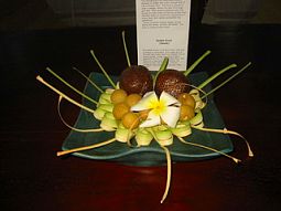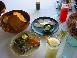 私が関心した点は、それらのフルーツをただお皿に盛って出すのではなく、予めレストランのテーブルの中央にその日の朝食で出すフルーツを飾っておき、客が着席して朝食のオーダーが始まってから、それらの果物を食べやすいようにカットしてくれるという拘り様です。