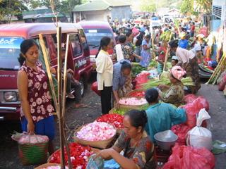 (上記 左側の写真は丘でのピクニックランチ、真ん中はウジュンからのサンライズ、右側はアムラプラの市場の様子です)