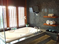 プール横のリビングスペースは大変広く清潔感があり、外でくつろぐもよし、TV付きのジャグジーでくつろぐもよし、大きなベッドでくつろぐもよし。