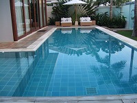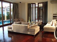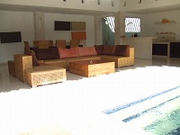 ブルーが美しいプール(2×10m)は、ソファからまっすぐ伸びており、お部屋は四角いつくりで無駄のない広々したスペースが広がります。
