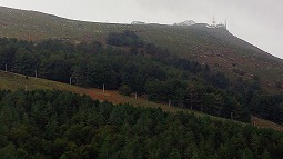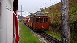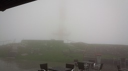 およそ35分で山頂に到着、しましたが、なんと山頂は暴風雨!展望台からは雲海しかのぞめず、乗客の皆さんとともにほうほうのていでカフェへ避難しました。