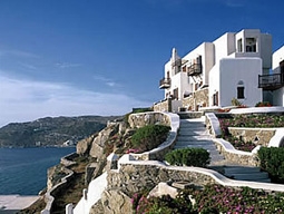 カボタゴーはミコノス島ではめずらしい城壁のような岩肌にいくつもの建物が連なった白いコテージ風のホテルで、そのデザインが国際デザイン賞まで受賞しています。紺碧の海が広がり、夕暮れ時の光景は絵もいわれぬ美しさ。賑やかなミコノスタウンから少し離れて、大人のムードが漂うホテルでのんびりと何もしない贅沢を味わってみてはいかがでしょう。