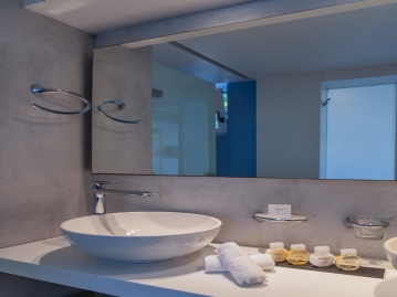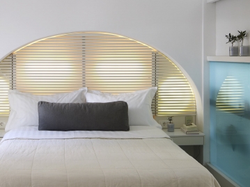 客室はそれぞれ異なるインテリアだが、すべてミコノス島の典型的な民家をイメージしており居心地がよい。