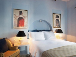 コスモポリタンスイーツは島の中心、タウンエリアにあるロマンチックなホテルです。ショッピングや食事に最も便利な位置にありながら、一歩道を入っているので驚くほどに静か。イアにある「カティキアス」を手掛けた建築家が流行のサントリーニ様式に仕上げています。