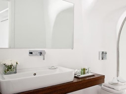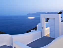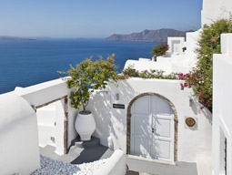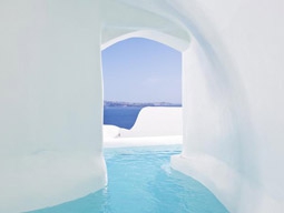 ホテルの敷地からはイアの白い町並みを眺めることができ、またお部屋も白を基調とした洗練された雰囲気が広がっています。