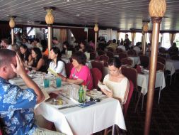 船はダイヤモンドヘッドを越えカハラコーストまで、徐々にオレンジ色に染まっていく海を滑るように進みます。ステージでは、ハワイのトップエンターにより、歌やフラダンスなどエキサイティングなショーが繰り広げられます。