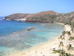 08:15頃、ワイキキを出発し、バスに乗り込みます。ドライバー兼ガイドのアキさんの軽快なトークで車内は和気あいあいとした雰囲気の中、バスはまず、ハナウマ湾へ向けて走ります。途中、ダイヤモンドヘッド登頂口付近で10分ほど停泊し、高台からの景色を楽しみます。