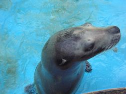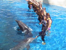 まずは、インストラクターの説明を聞きます。ふむふむ、勝手に触るとイルカが今まで頑張って積んできたトレーニングが無駄になってしまうので、インストラクターの指示がある時以外はイルカに触ってはいけないんだな。イルカの背中や、背泳ぎしているイルカのお腹に触れたり、イルカと握手したりキスしたり・・・イルカはとても愛嬌があり、可愛くて癒されます。一人がイルカに触れられる回数も多く、まるでイルカとお友達になったようでした!