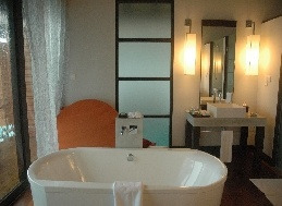 ビーチヴィラは1棟1室のビーチ目の前に建ち96㎡。部屋の設備はデラックスバンガローよりグレードアップされており、エスプレッソマシーンやiPodドッキングステーションがあります。テラスにはデイベッドが置かれ、そこから海を見ることができます。またビーチヴィラのバスルームも半屋外となり、水上ヴィラと同じバスタブがあります。