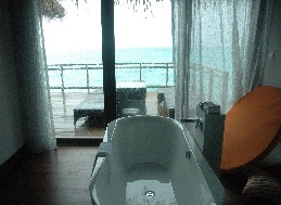 バスルームはシャワーブースとバスタブが分かれていて、バスルームの真ん中位に置かれたバスタブの周りには小石が敷かれ、お湯が溢れても大丈夫な様になんとも機能的でお洒落感が漂っています。もちろんバスタブに浸かりながら海は見えるし、シャワーブースの窓もガラスになっていて、覗くと海(水面)が見えます♪