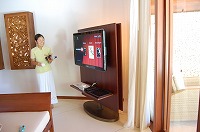 ベッドルームにある大きな液晶テレビはモルディブ初!オンデマンドタイプになっていて、テレビでDVD(映画など)が選べたり、インターネットが出来たり、ゲームが出来たり・・・もし雨でも全く退屈しません!