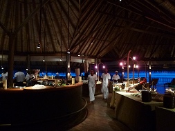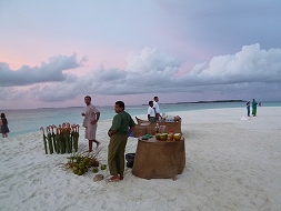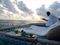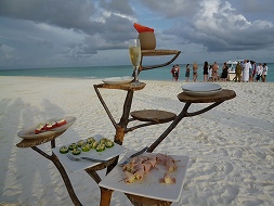 週に1度ひらかれるサンドバンクでのカクテルパーティー。サンドバンクはリゾートからボートで10分ほどの砂でできた小さな島。リゾートのスタッフやゲストが集まってシャンパンや軽食をいただきながら思い思いに過ごします。夕暮れ時から暗くなるまで空の色がどんどん変わってとてもきれいです。
