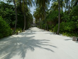 桟橋からフロントまで、写真中央のココナッツロードを歩きます。細かな白砂に周りの壮大な椰子の木、圧巻でした!他モルディブのリゾートでは体験できないと思います。