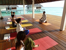 朝ヨガです。このほかにもAQUAヨガがあり、曜日によって変わります。波の音と、先生の声しか聞こえないのでとてもリラックスできます。