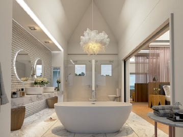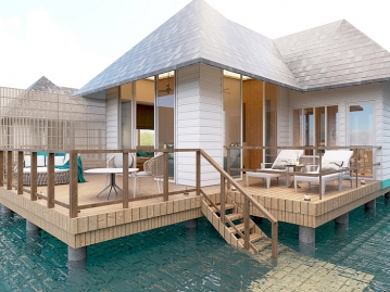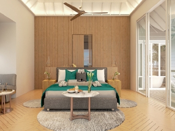 お部屋タイプ大きく分けて2つ、ビーチヴィラと水上ヴィラがあり、一番人気はやはり水上ヴィラです。水上ヴィラは全22部屋の約100㎡と十分に広く、白を基調としスタイリッシュな造りとなっています。新設のプール付き水上ヴィラはさらに広い150㎡となっており、よりラグジュアリーな宿泊をお求めの方にもってこい!
