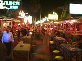 空港からパトンビーチまでは車で50分程かかります。私達がパトンビーチに到着したのは現地時間の22時近くでした。それから夕食を食べるために街へ出たのですが深夜まで音楽が鳴り響き、人々で賑わっていました。 レストラン・ディスコ・バーなどのネオンがとても鮮やかでした。 夜遊びをしたい方!! パトンビーチエリアがオススメです。 逆に言えば、ゆったりとリゾート気分を味わいたい方はパトンビーチエリア以外のエリアをオススメします。ハネムーン、カップルのお客様、小さなお子様連れのお客様にはパトンビーチは騒がしすぎるかなと感じました。