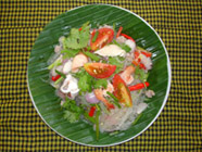 ゆでた春雨に、パクチー、ネギ、トマト、玉ネギに、お好みの具 (写真はシーフード) を入れ、 マナオ (レモン汁) 、砂糖、唐辛子、ナンプラーで和えたさっぱりサラダです。 食欲のない時にもイケル1品です。