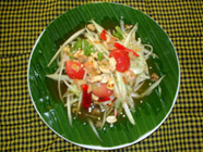 青いパパイヤに、豆、トマト、ピーナツなどをいれ、唐辛子、ニンニク、砂糖、ナンプラー、マナオ(レモン汁)、で和えたスパイシーなサラダ。 日本で云うと、すり鉢 (タイ語でクロック) に入れて、すりこ木 (タイ語でサー) でトントンと叩いて作ります。 ソムタムはもち米を一緒に食べるのが一般的で、付け合わせは生野菜をかじりながらいただきます。 タイ人はこのソムタムが大好きで、人が集まればソムタムパーティーが始まります。