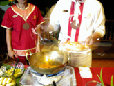 蓮の花を一人1つ受け取って、入り口近くの家に浮かべて、その日の疲れを流す儀式が行われます。 その後、奥に進んだところで、手にトロピカルフラワー水をかけて幸せが訪れる様にスタッフがお祈りしてくれます。