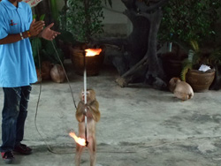 上の写真はチャウエン北部にあるモンキーセンターです。1日3回行われるショーが見ものです。伝統のタイ舞踊、格闘技が披露された後、メインのモンキーショーがはじまります。バスケットボール、三輪車など達者な芸を見せた最後は、ヤシの木にするすると登り、ヤシの実を上から落とすという芸も見せてくれます。なかなかのエンターテイナーぶりなので機会があれば是非、行ってみてください!