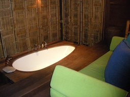 写真3:木床に埋め込まれた大きなバスタブ。ゆうに2人は入れます。