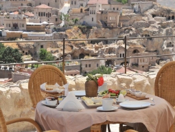 ホテルからは、カッパドキアの奇岩景色を一望でき、また、早朝は、上空を飛ぶ気球をホテルから眺めることもできます。