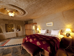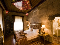 客室はそれぞれに個性的で、アーチ天井の部屋や石壁造りの部屋、自然の岩をそのまま活かした洞窟のような部屋などがあり、それぞれにアンティークな調度品やトルコらしい絨毯、タペストリーなどが配され趣深い造りとなっています。