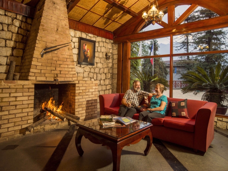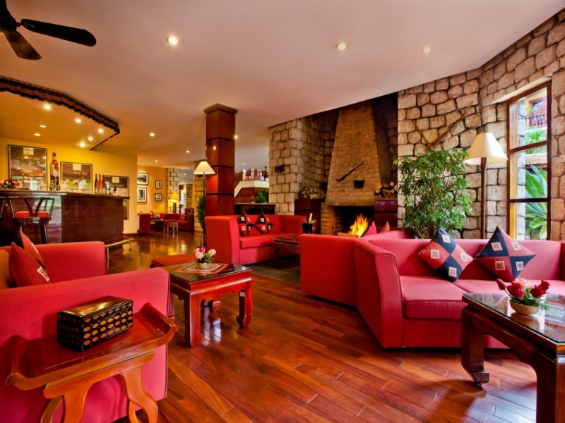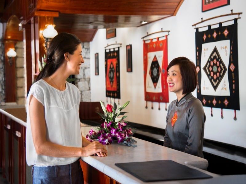 中国との国境に程近い標高1,600mの高原都市サパの小高い丘の上に、庭園を取り囲むように建てられた木と石造りの山小屋風ホテルがヴィクトリア・サパ。ホテルのフロントスペースには時折少数民族が入り込んで、旅行客とおしゃべりをしたり、ハンドクラフトを売ったりしている姿も。客室はフォークロア調で広いテラスもついています。暖炉のあるロビーもサパならでは。