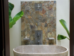 視察した「シービューバンガロー」のお部屋にはアウトドアシャワーのほかにコロンとしたかわいらしい形のバスタブがついていました。