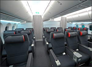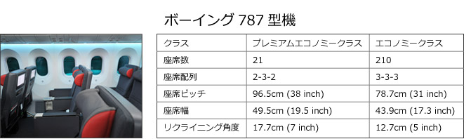 ボーイング787ドリームライナーでは、お座席と足元にゆとりを持たせた「プレミアムエコノミークラス」をご利用頂けます。 プレミアムエコノミークラスでは、スペシャルアメニティーや空港内での優先サービスのほか、高画像タッチスクリーンナビゲーションやゲーム、オーディオブックといった最先端のエンターテイメントプログラムをご利用頂けます。更に充実した空の旅をお楽しみください。